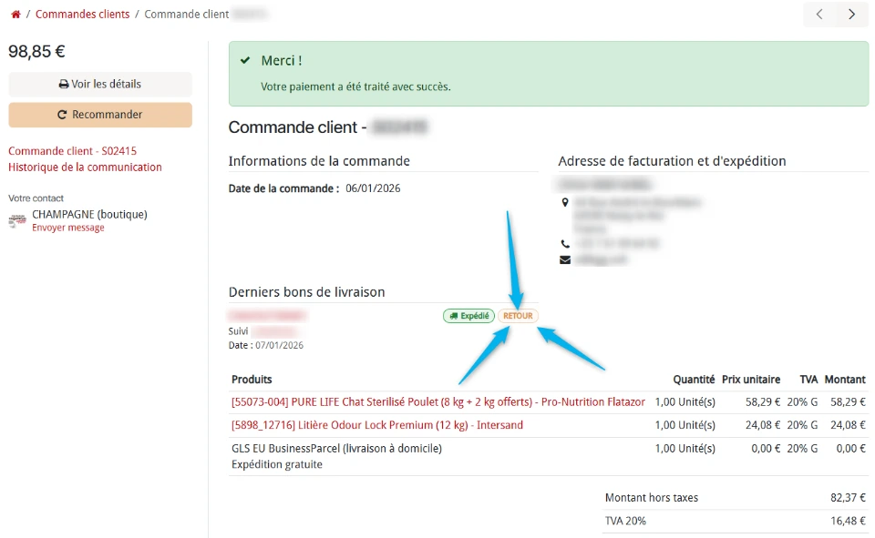 Afin de faciliter le traitement du retour, joignez à l'intérieur de votre colis le bon de retour logistique disponible depuis votre historique de commandes :